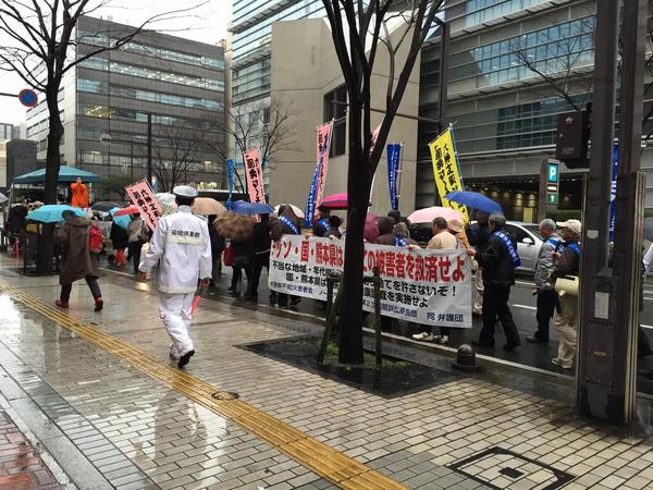 雨の中、九州各地でたたかっている団体がひとつになって、「自然をのこそう、公害いらない、差別はいらない、戦争いらない、未来をつくろう」とシュプレヒコールをあげました。