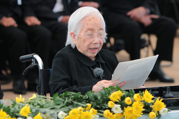 慰霊式では,上野エイ子さんが,遺族を代表して祈りのことばを述べました。上野さんは,2歳半で亡くなった長女に「死んでしまった良子,お前は今でも寝たままなの」と呼びかけました。この間に父や夫を水俣病で亡くしていた上野さんにとって,耐え難い時期を思い返すものだったと思います。会場のあちこちですすり泣きがもれました。