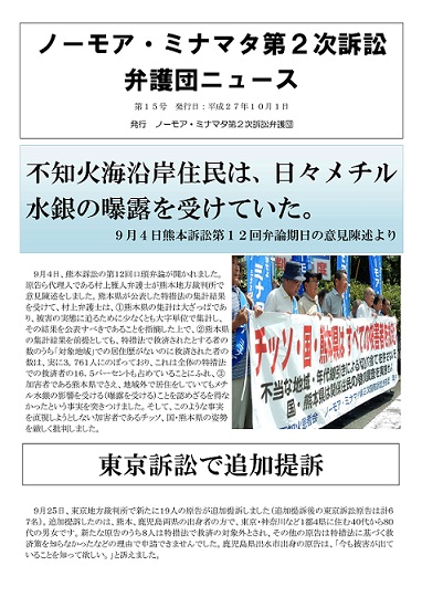 弁護団ニュース第15号 弁護団ニュース 2015.10.012025.12.29 弁護団ニュース第15号を発行しました。 弁護団から訴訟経過や活動、水俣病に関する情報についてお伝えします。 第15号の内容は、 ・熊本訴訟第12回弁論期日 ・東京訴訟追加提訴 ・9月19日、20日一斉検診実施 等です。 弁護団ニュース第15号