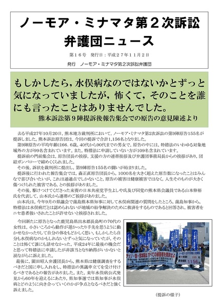 弁護団ニュース第16号 弁護団ニュース 2015.11.022025.12.29 弁護団ニュース第16号を発行しました。 弁護団から訴訟経過や活動、水俣病に関する情報についてお伝えします。 第16号の内容は、 ・熊本訴訟第9陣提訴 ・東京訴訟第3回弁論 ・近畿訴訟第4回弁論 等です。 弁護団ニュース第16号