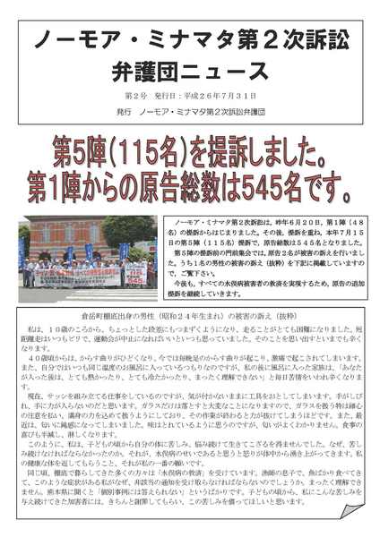 弁護団ニュース第2号 弁護団ニュース 2014.07.312025.12.29 弁護団ニュース第2号を発行しました。 弁護団から訴訟経過や活動、水俣病に関する情報についてお伝えします。 第2号の内容は, ・第5陣の提訴 ・第5陣原告の被害の訴え ・裁判について 等です。 弁護団ニュース第2号