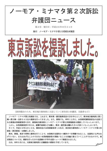 弁護団ニュース第3号 弁護団ニュース 2014.08.312025.12.29 弁護団ニュース第3号を発行しました。 弁護団から訴訟経過や活動、水俣病に関する情報についてお伝えします。 第3号の内容は, ・東京訴訟の提訴 ・2014年ミナマタ現地調査 です。 弁護団ニュース第3号