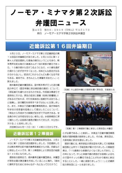 弁護団ニュース第45号 弁護団ニュース 2019.05.172025.12.29 第45号の内容は、 ・近畿訴訟第16回弁論期日 ・近畿訴訟第12陣提訴 ・東京訴訟(第5・6陣)第1回弁論期日 等です。 弁護団ニュース第45号