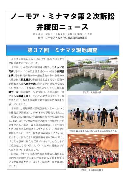 弁護団ニュース第47号 弁護団ニュース 2019.09.132025.12.29 第47号の内容は、 ・第37回 ミナマタ現地調査 ・近畿訴訟第17回弁論 ・東京訴訟(5・6陣)第2回弁論 等です。 弁護団ニュース第47号