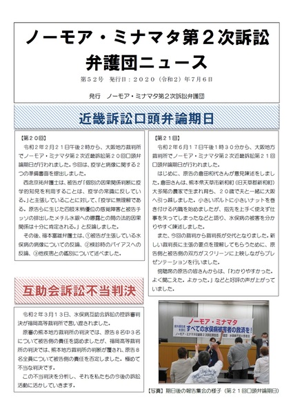 弁護団ニュース第52号 未分類 2020.07.06 第52号の内容は、 ・近畿訴訟口頭弁論期日 ・互助会訴訟不当判決 ・「水俣病被害者とともに歩む国会議員連絡会」 新体制のもとで活動強化を確認 等です。 弁護団ニュース第52号
