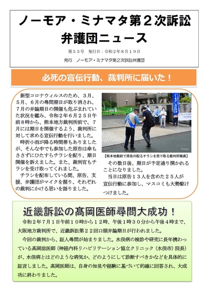 弁護団ニュース第53号 未分類 2020.08.19 第53号の内容は、 ・必死の宣伝行動、裁判所に届いた! ・近畿の髙岡医師尋問大成功! ・熊本訴訟の髙岡医師尋問も大成功!! 等です。 弁護団ニュース第53号