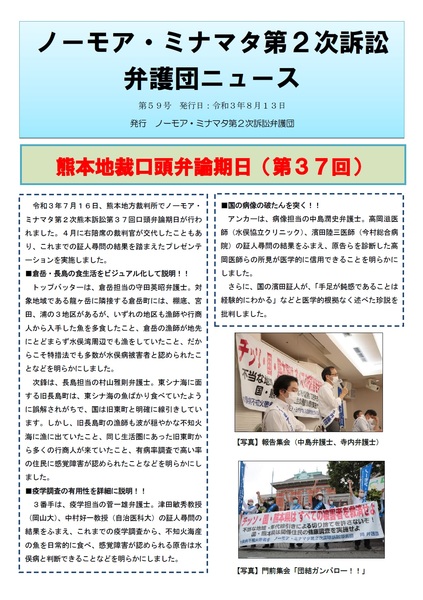 弁護団ニュース第59号 未分類 2021.08.13 第59号の内容は 熊本地裁口頭弁論期日(第37回) 大阪地裁口頭弁論期日(第29回) 環境大臣交渉(6月29日) 環境省特対室交渉(7月9日) 等です。 弁護団ニュース第59号