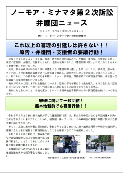 弁護団ニュース第61号 弁護団ニュース 2022.03.112025.12.29 第61号の内容は 原告団・弁護団・支援者の要請行動in東京 熊本地裁前の要請行動 熊本地裁口頭弁論期日(第38回) 大阪地裁口頭弁論期日(第33回) 等です。 弁護団ニュース第61号