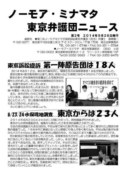 東京弁護団ニュース第2号 弁護団ニュース 2014.09.262025.12.29 東京弁護団ニュース第2号を発行しました。 東京訴訟の弁護団から東京訴訟等についてお伝えします。 第2号の内容は, ・東京訴訟提訴 第一陣原告団は18人 ・8/23 ,24 水俣現地調査 東京からは23 人 等です。 東京弁護団ニュース第2号