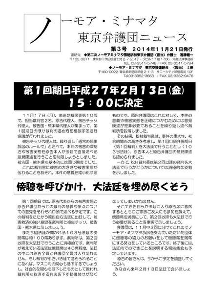 東京弁護団ニュース第3号 弁護団ニュース 2014.11.212025.12.29 東京弁護団ニュース第3号を発行しました。 東京訴訟の弁護団から東京訴訟等についてお伝えします。 第3号の内容は, 第1回期日平成27年2月13日(金)15:00に決定 等です。 東京弁護団ニュース第3号