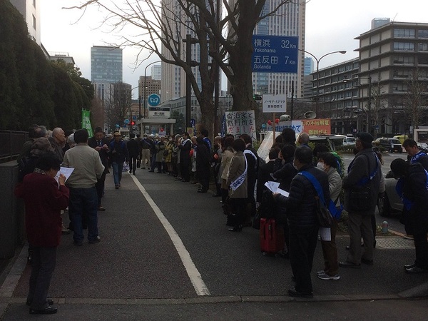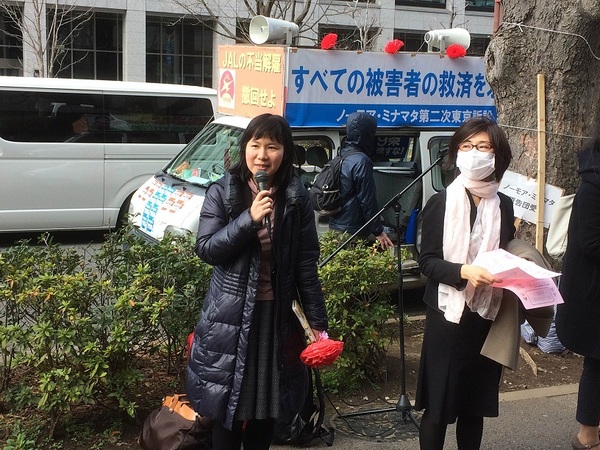 3月3日はひな祭りなので、「ひな祭り大行動」と題して、女性が中心となって、門前で街頭宣伝とビラ配りを行いました。参加者たちは、ひな祭りにちなんで、ピンク色のチラシとひなあられを通行人に配布し、水俣病救済の必要性などを訴えました。