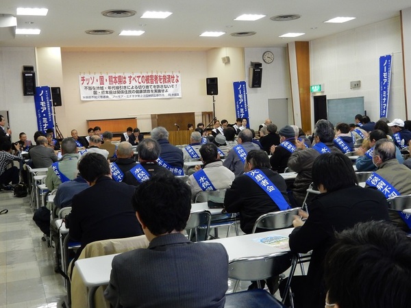 報告集会では,森正直原告団長から開会挨拶をおこない,日本共産党熊本県委員会の日高信也委員長,水俣病闘争支援熊本連絡会議の原田俊郎事務局長から連帯挨拶をいただきました,