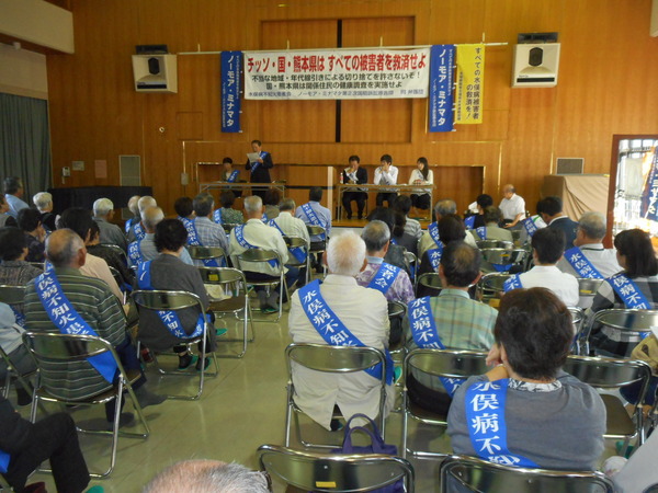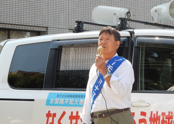 弁論に先立つ門前集会では、森正直原告団長が「8月26日,27日にミナマタ現地調査を行い、人命より利益を優先する企業が被害をいかに広げてきたかを知ることができた。また、被害が深刻であることを被害者本人から語ってもらったことで、全域の住民調査が必要であることを確認できた。
