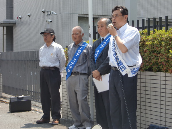 (門前集会の様子,右から園田昭人弁護団長,飯尾正二原告団長)