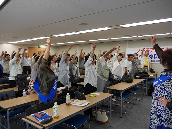 進行協議の後の報告集会では,徳井弁護団長が挨拶し,弁護団から,口頭弁論の解説,次回提出予定の書面の概要説明などを行いました。前回に引き続き熊本から駆け付けた村山弁護士からは,熊本の裁判の状況の報告がありました。