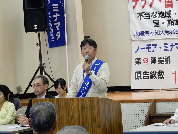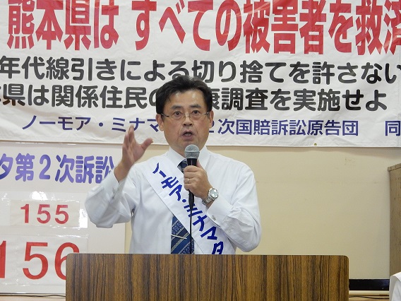 山本氏は,今年9月の県議会で蒲島熊本県知事に対して水俣病関連の質問をしたところ,蒲島知事から,特措法は水俣病だとは認められないが地域の紛争解決のために救済をするものであると回答され,被害者をニセ患者扱いされたことが許せないと挨拶されました。