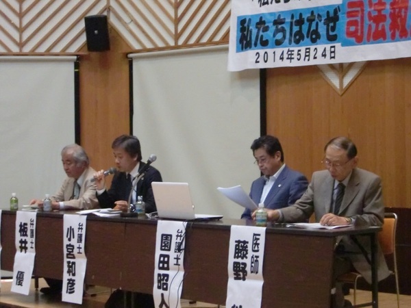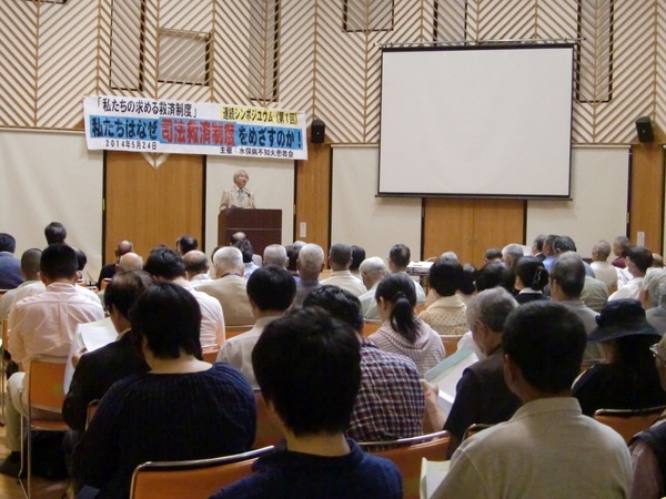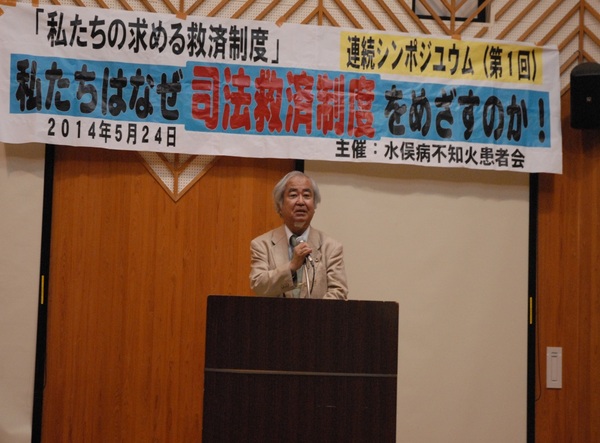 平成26年5月24日(土)午後2時から,水俣市もやい館3階もやいホールにて,水俣病不知火患者会主催の連続シンポジウム「私たちの求める司法救済制度」(第1回)が開催されました。
